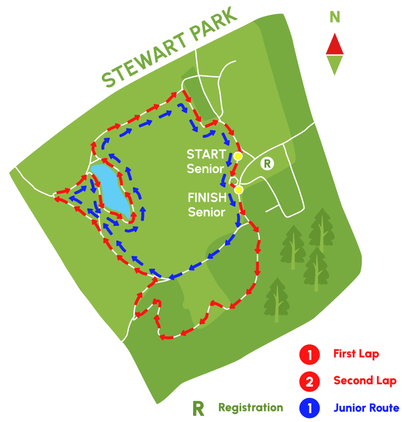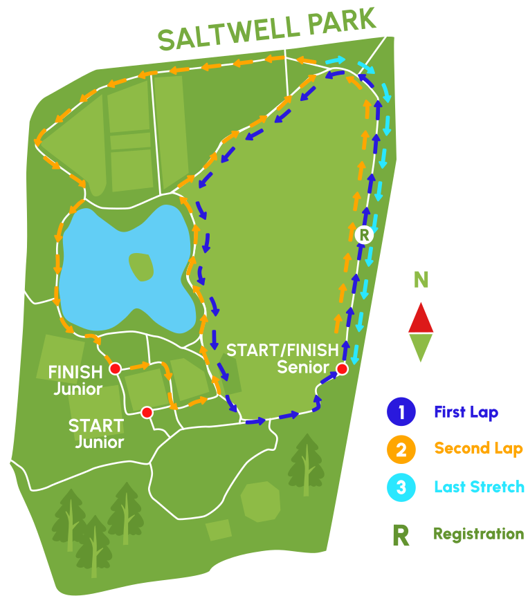 Senior 5k: Two laps all on path around the park, going alongside the pond and through the wooded area at the back of the park. Start and finish close to the main car park.